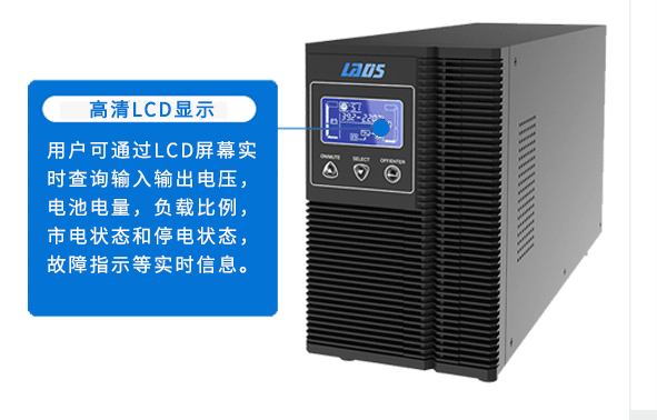 用戶可通過LCD屏幕實時查詢輸入輸出電壓,電池電量,負載比例,市電狀態(tài)和停電狀態(tài),故障指示等實時信息。